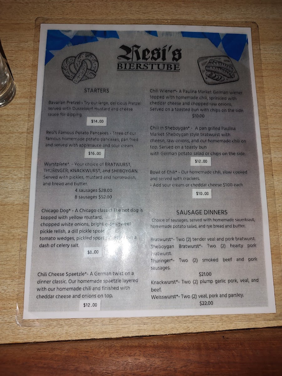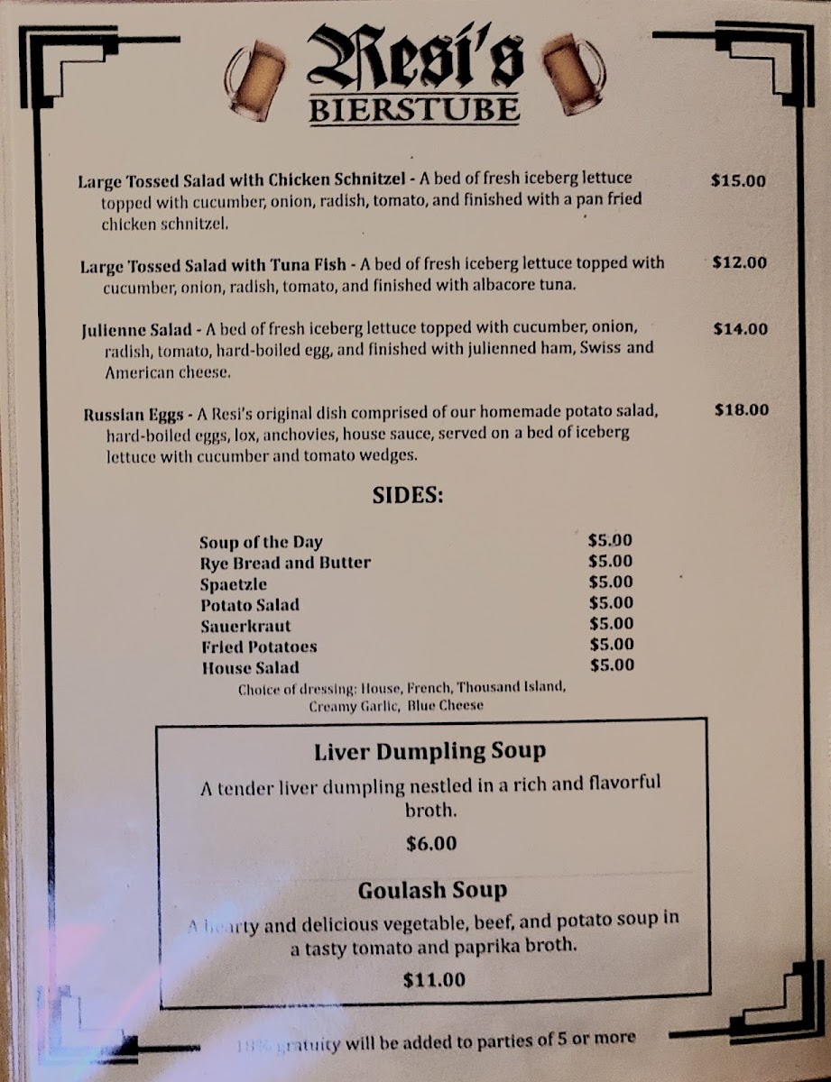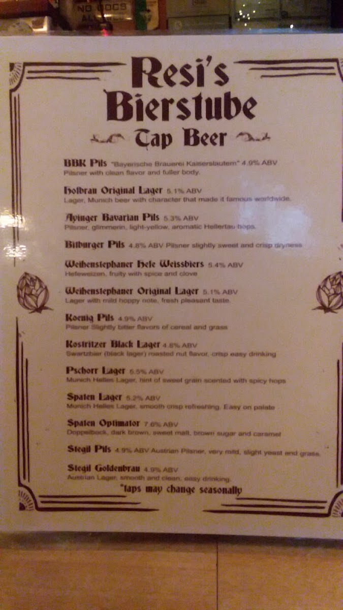This menu suits patrons seeking traditional German fare and beverages, appropriate for casual meals or social drinking occasions. Offerings provide a balance between hearty entrées and lighter fare, alongside a diverse beer selection typically enjoyed in a bar or beer garden setting.